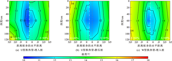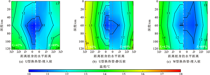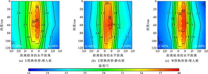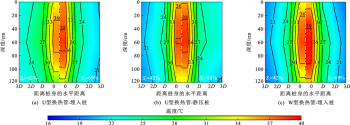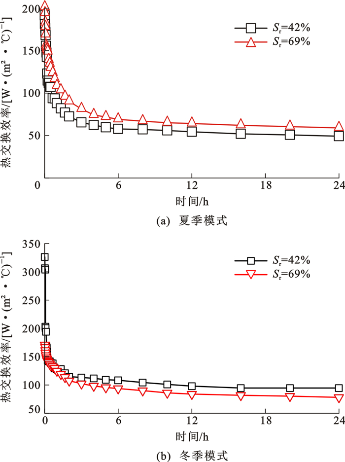 为研究黄土地基中能量桩热交换效率特性,开展了夏季/冬季模式下不同饱和度黄土中能量桩模型试验。试验采用了饱和度分别为42%、69%的重塑黄土,模型桩为钢筋混凝土预制桩,内置了U型、W型2种换热管,桩径采用了50、65、80 mm三种规格,利用埋入/静力压入2种方式将能量桩设置在黄土中。试验结果表明:桩土温度场表现出明显的三维特征,桩土热量交换以水平方向为主,能量桩温度水平影响范围不小于3倍桩径;桩侧土温度梯度与黄土饱和度、运行模式、施工挤土效应及换热管型式密切相关;整体上,夏季模式下能量桩热交换效率低于冬季模式,夏季模式下黄土饱和度较高时热交换效率也较高,而冬季模式下相反;不论冬季模式还是夏季模式,黄土饱和度相同时,W型换热管埋入桩热交换效率高于U型换热管静压桩,U型换热管埋入桩的热交换效率最低,桩径为50、65 mm能量桩的热交换效率基本相当,而桩径为80 mm能量桩的热交换效率显著降低;与非挤土桩相比,挤土桩能平均提高热交换效率约13.7%。