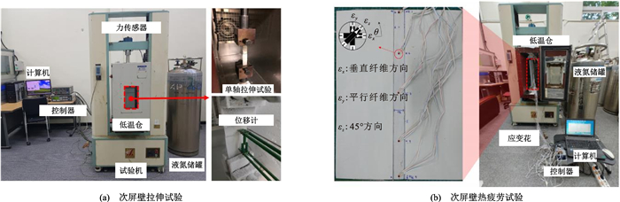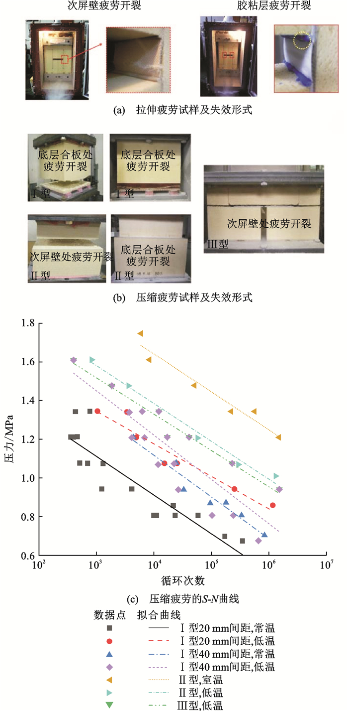 部件 常温(25 ℃) 低温(-163 ℃、-110 ℃) 参考文献 波纹板承载能力/MPa 抗拉: 模量195 000, 强度170 抗拉: 模量195 000, 强度700 [27]、[28] 层合板承载能力/MPa 抗压: 模量80,强度6.11抗拉: 强度65.81抗弯: 模量5 680,强度55.90 抗压: 模量210,强度81.00抗拉: 强度67.70抗弯:模量: 9 490,强度92.70 [24]、[32] 绝热层泡沫承载能力/MPa 抗压: 模量67,强度1.56抗拉: 模量134,强度2.52 抗压: 模量142,强度1.97 [63]、[34] 次屏壁承载能力/MPa 抗拉: 模量6 400,强度187 抗拉: 模量10 822,强度369 [26]、[36] 围护系统整体疲劳循环次数 法向: 不小于163 面内(-110 ℃): 不小于7 050;法向(-163 ℃): 不小于145 [6]、[21] -