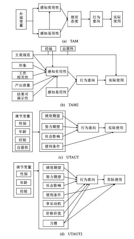 图  4  TAM、TAM2、UTAUT、UTAUT2的结构